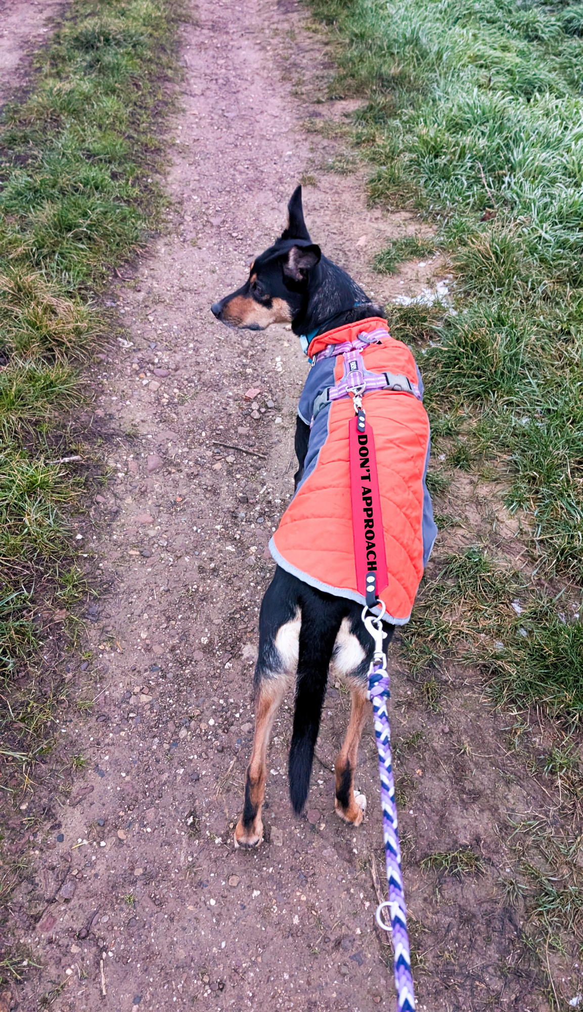 - Customisable text options (e.g. “Do Not Touch”, “In Training”, “Reactive Dog”, “Friendly”, “Deaf Dog”) on both sides.